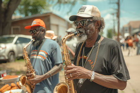A backyard Juneteenth celebration featuring a live jazz band, with guests enjoying the music, dancing, and a spread of soul food, creating a warm atmosphere of community and remembrance.