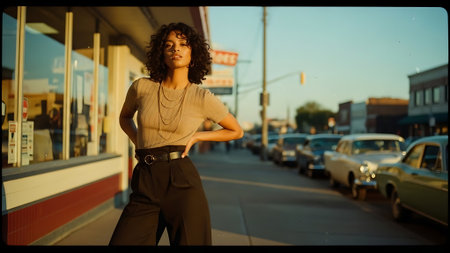 Beautiful young african american woman with curly hair, wearing brown blouse and pants, standing in front of a gas station.