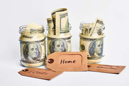 Monthly budget notebook next to banknotes, coins and jar full of rolled up receipts. Increase in tariffs and prices.