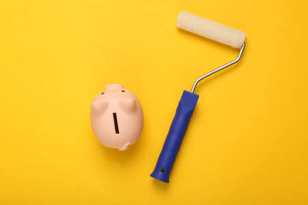 Paint roller with piggy bank on yellow background. home renovation concept. top view