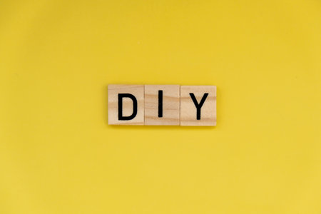 DIY text on bright yellow background. Concept of creative crafting handmade hobby. Art therapy activities mental health healing