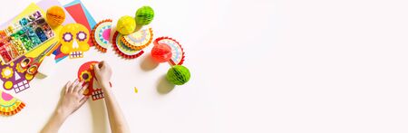Holiday Cinco de mayo Mexican Decoration for the festival. Garland skull painted with patterns. Hands of a child.