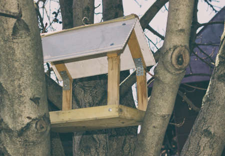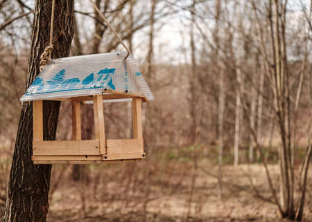 Wooden birdhouse on tree for birds. Feeder, care, help birds and animals for birds. craft with children.