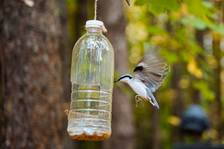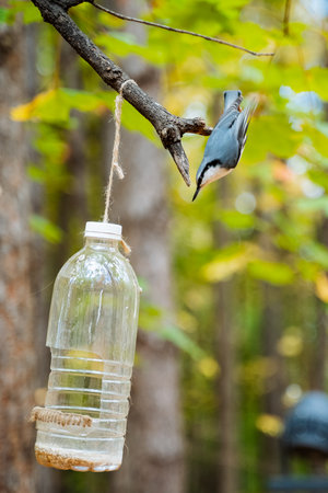 A lovely nuthatch perches gracefully near a homemade bird feeder made from a plastic bottle, surrounded by a lush green forest displaying vibrant autumn hues that enhance the serene atmosphere