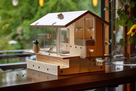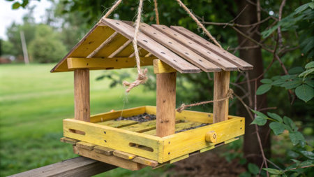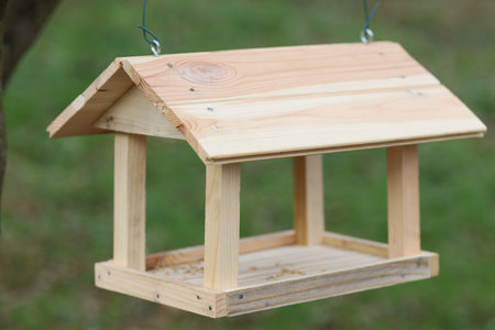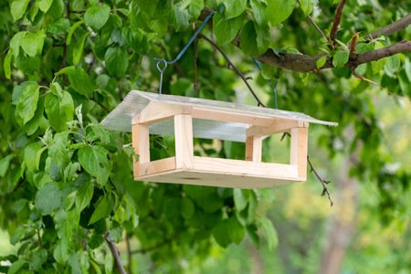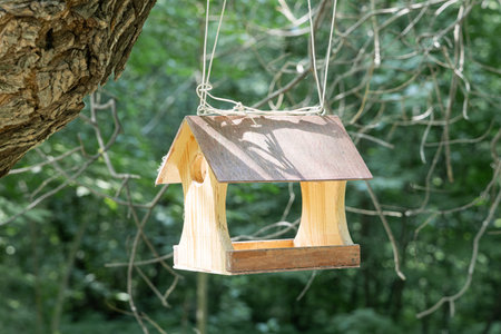 A beautifully crafted wooden bird feeder is currently suspended from a sturdy tree branch, providing a perfect feeding spot for local birds to visit and enjoy their meals