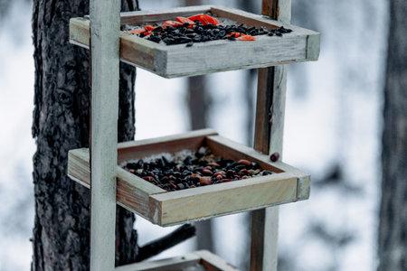 Beautiful feeder for birds on blurred background of winter snowy forest. Taking care of birds in cold winter season. Selective focus.