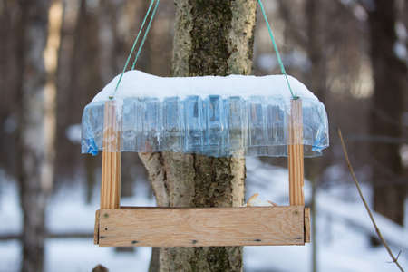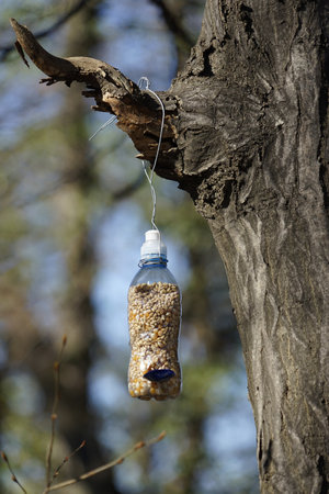Handmade bird feeder from a plastic bottle on a tree in the forest. Caring for the inhabitants of the forest
