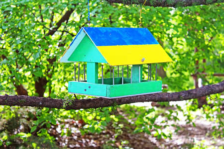painted wooden house birdhouse on a tree in the garden. Care and feeding of birds.