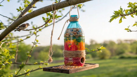 A vibrant bird hovers near a homemade plastic bottle feeder, beautifully suspended in the lush surroundings of a stunning forest, showing the incredible beauty of nature and wildlife