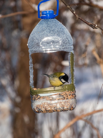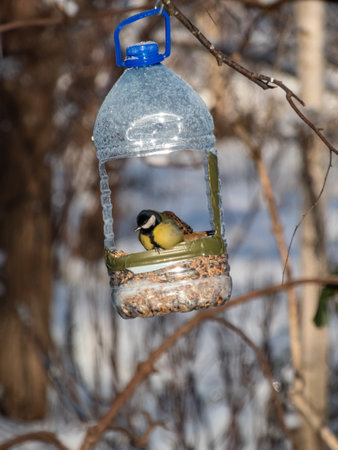 Tits eat sunflower seeds from handmade feeder. Winter feeding of garden birds Great Tit or Parus major. Eco-friendly lifestyle, environmental conservation.