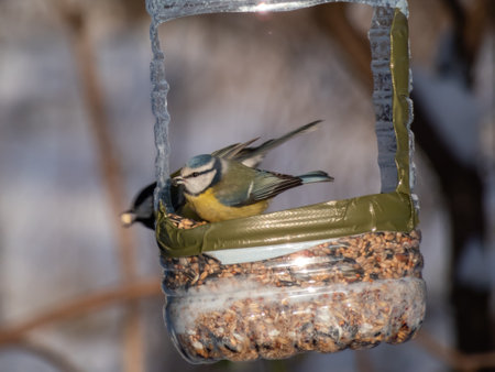 Eurasian Blue Tit (Cyanistes caeruleus) visiting bird feeder made from reused big plastic bottle full with grains in winter. DIY plastic bird feeder bottle hanging in the tree