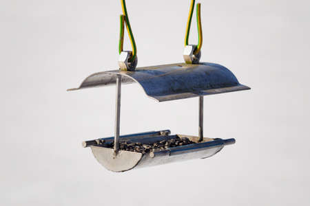 Vintage bird feeders. Handmade. Bird feeder covered with snow. Small depth of field.