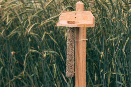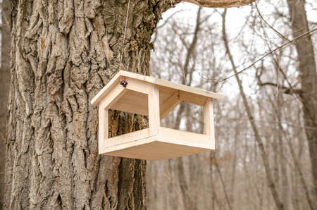 A New yellow bird and squirrel feeder house from plywood is hanging on a brown tree in a park in summer