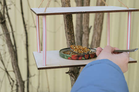 Man keeping at the tree birds feeder and preparing to the feeding birds