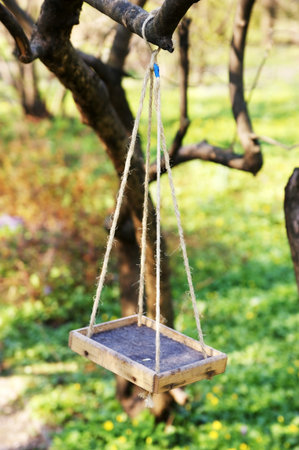 homemade wooden bird feeder weighs on a tree in the woods on a summer day