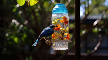 In a vibrant woodland, a charming bird visits a homemade feeder, showcasing wildlifes splendor on a sunny day, capturing the essence of outdoor life and its joy for nature lovers