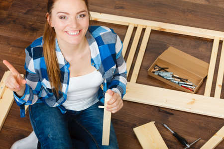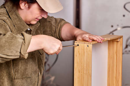 Woman assembling wooden furniture using screwdriver. DIY enthusiast. Young girl doing home improvement.