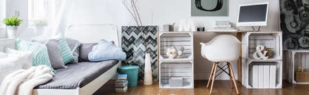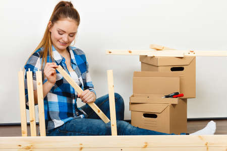 Woman moving into new apartment house assembling furniture. Young girl arranging interior and unpacking boxes.