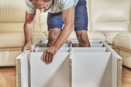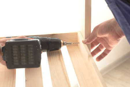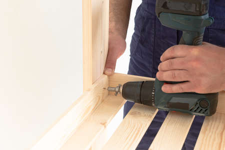 Handyman is assembling drawer of flat pack furniture by screwdriver.