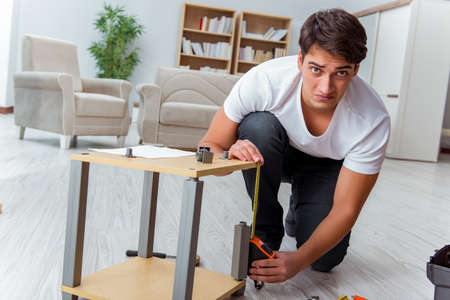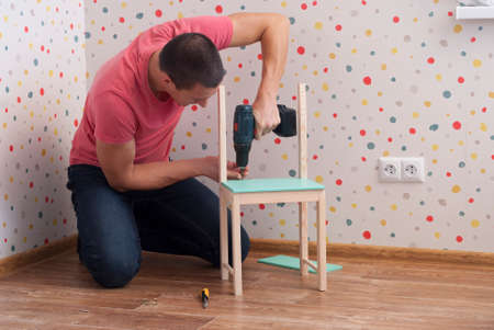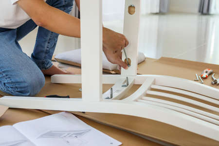 Man assembly wooden furniture,fixing or repairing house with screwdriver tool.modern living concepts ideas