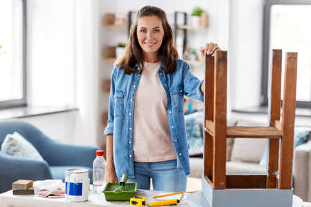 Young woman assembles furniture by herself while renovating her new apartment. DIY and house improvement concept