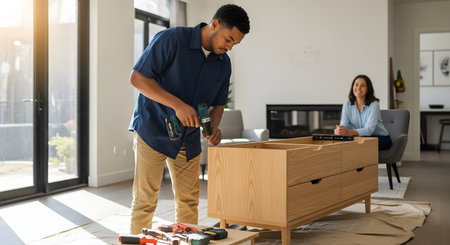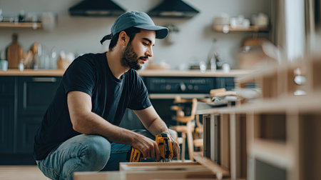 Lviv Ukraine 12.10.2025 A person works on assembling furniture in a home workshop. Wood pieces are spread out. Tools are nearby. The room has a light color and various items present.