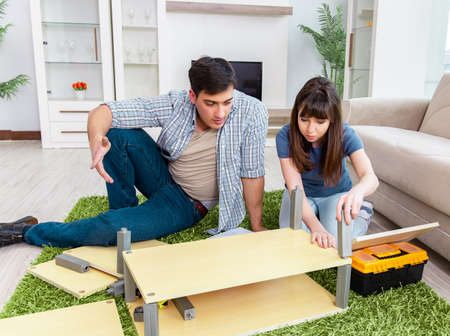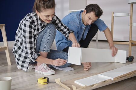 Happy young couple taking delight in putting together self assembly furniture as they move into their new house.