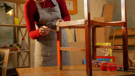 Teenage boy helps restore an old table. Child paints wooden pedestal with brush