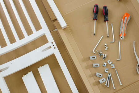 Assembly of furniture, the different parts and pieces of furniture arranged on the wooden floor. DIY furniture assembly concept. screwdriver and a lot of bolts and screws