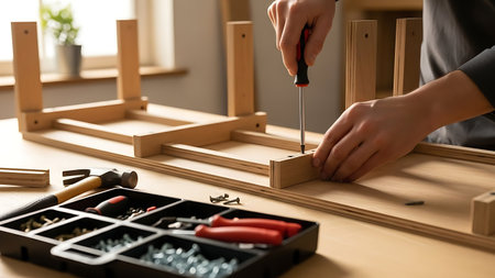 furniture piece parts and tools on the wooden table with copy space during assembly process