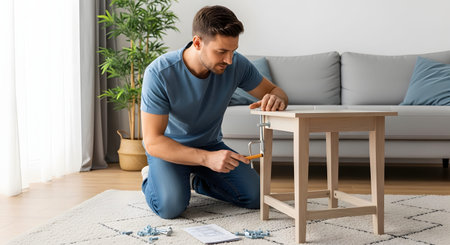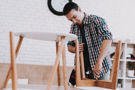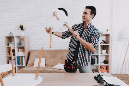 Young Man Assembling Coffee Table and Stools. Furniture Fittings. Engineer with Tool. Young Man at Home. Wooden Coffee Table. Selfmade Furniture. Man and Hobby. White Table in Room.