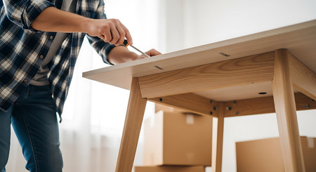 Close up of unrecognizable person tightens screw while assembling furniture indoor