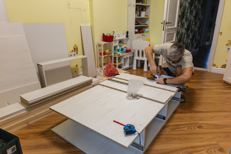 Lviv Ukraine 12.10.2025 A person works on assembling furniture in a children's room. Tools and wooden pieces are spread out on the floor, showing an active home project.