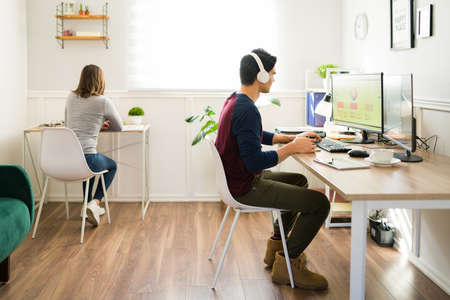 Gen z young woman and man seen from behind sitting at their desks and working on a new design at the office