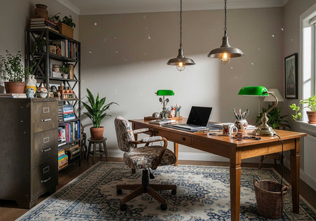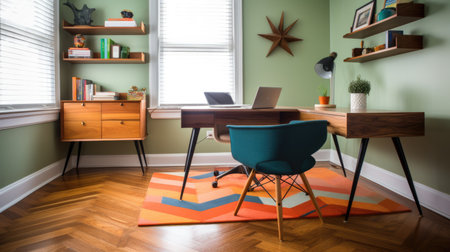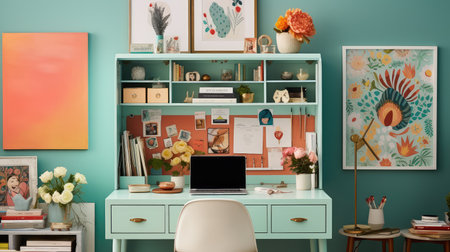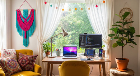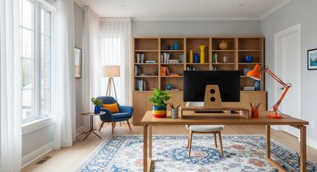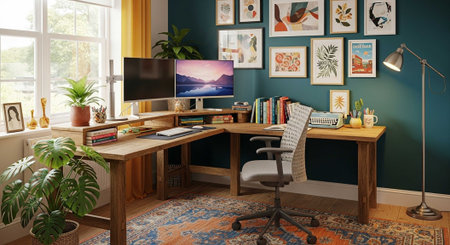 A vibrant and colorful home office with a desk, chair, and plants in a cozy atmosphere