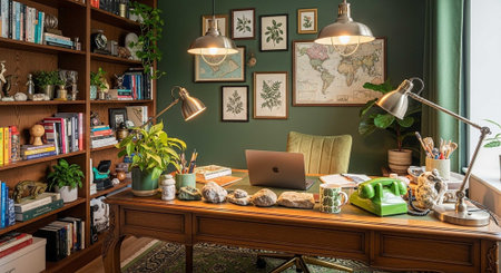 A well-organized home office with a wooden desk, laptop, and plenty of plants and books