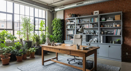 Open space home office interior with desk, chair, plants and modern sitting area in the background