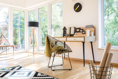 Modern home office with black lamp, clock and metal chair in bright apartment with terrace