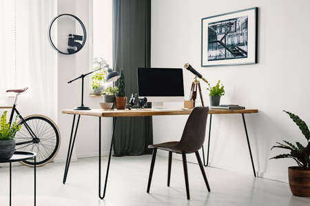 Hairpin desk with mockup monitor, plants and telescope standing in bright room interior with poster on the wall and window with drapes