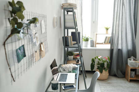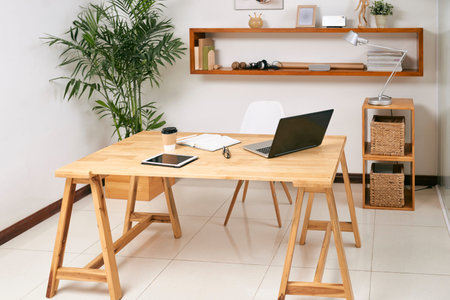 Workplace of remote student or freelancer consisting of table with supplies