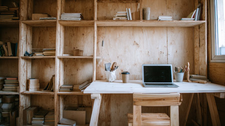 A well-organized home office with a desk, chair, and bookshelves in a cozy and natural setting