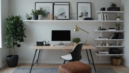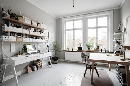 White scandinavian contemporary home office with miniature greenhouse and decorative shelf