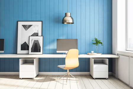 Light room with blue walls and wooden table with computer and chairs in home office