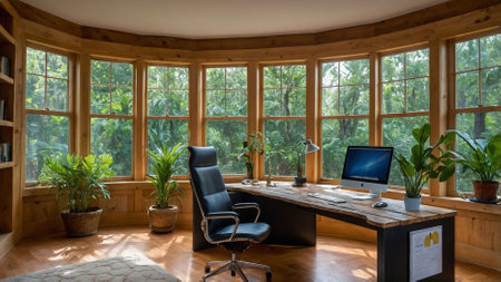 A cozy home office with a wooden desk, comfortable chair, and plenty of natural light