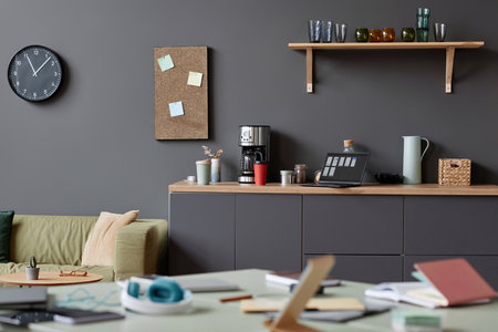 Background image of lived in cluttered office space in neutral grey with focus on coffee station, copy space