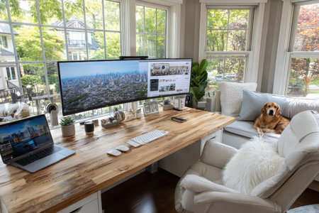 A cozy home office with a dog on the window seat and computer setup