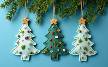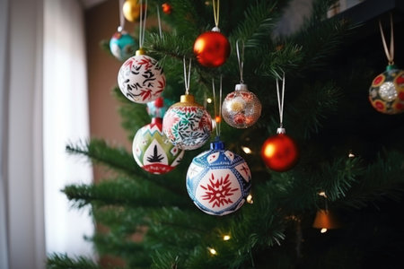 Eco friendly Christmas ornaments hanging on a Christmas tree creating a festive atmosphere