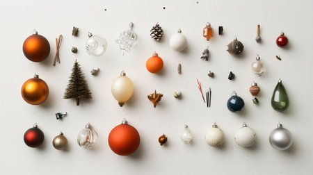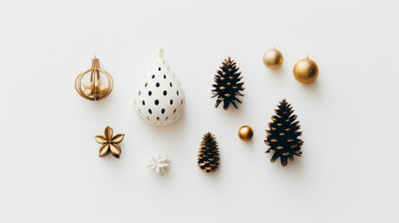 A flat lay of minimalistic Christmas ornaments against a white background AI generated illustration
