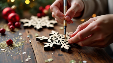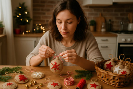 Woman tying a string to a handmade Christmas tree ornament, creating festive decorations for the holiday season in a cozy home kitchen setting