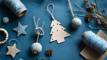 Wooden tree ornament surrounded by stars, baubles, yarn, and spices on textured blue surface. Perfect for festive crafting or seasonal design themes.